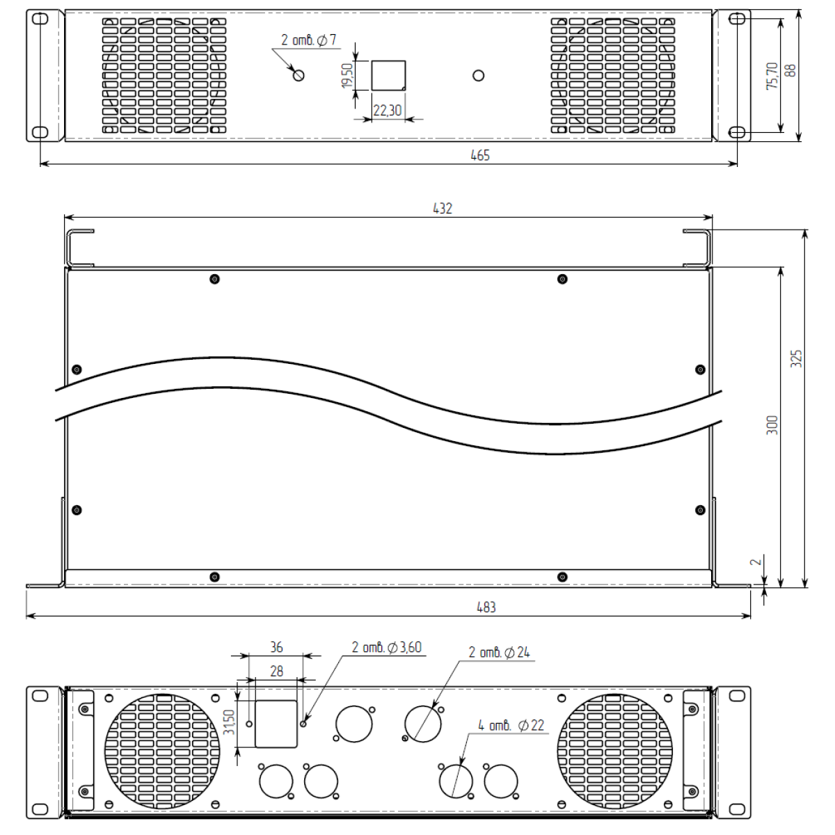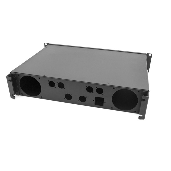 На задней панели корпуса усилителя мощности звука выполнены отверстия для подключения двух каналов, а также установки разъема питания с предохранителем и установки 2-х вентиляторов 80х80.