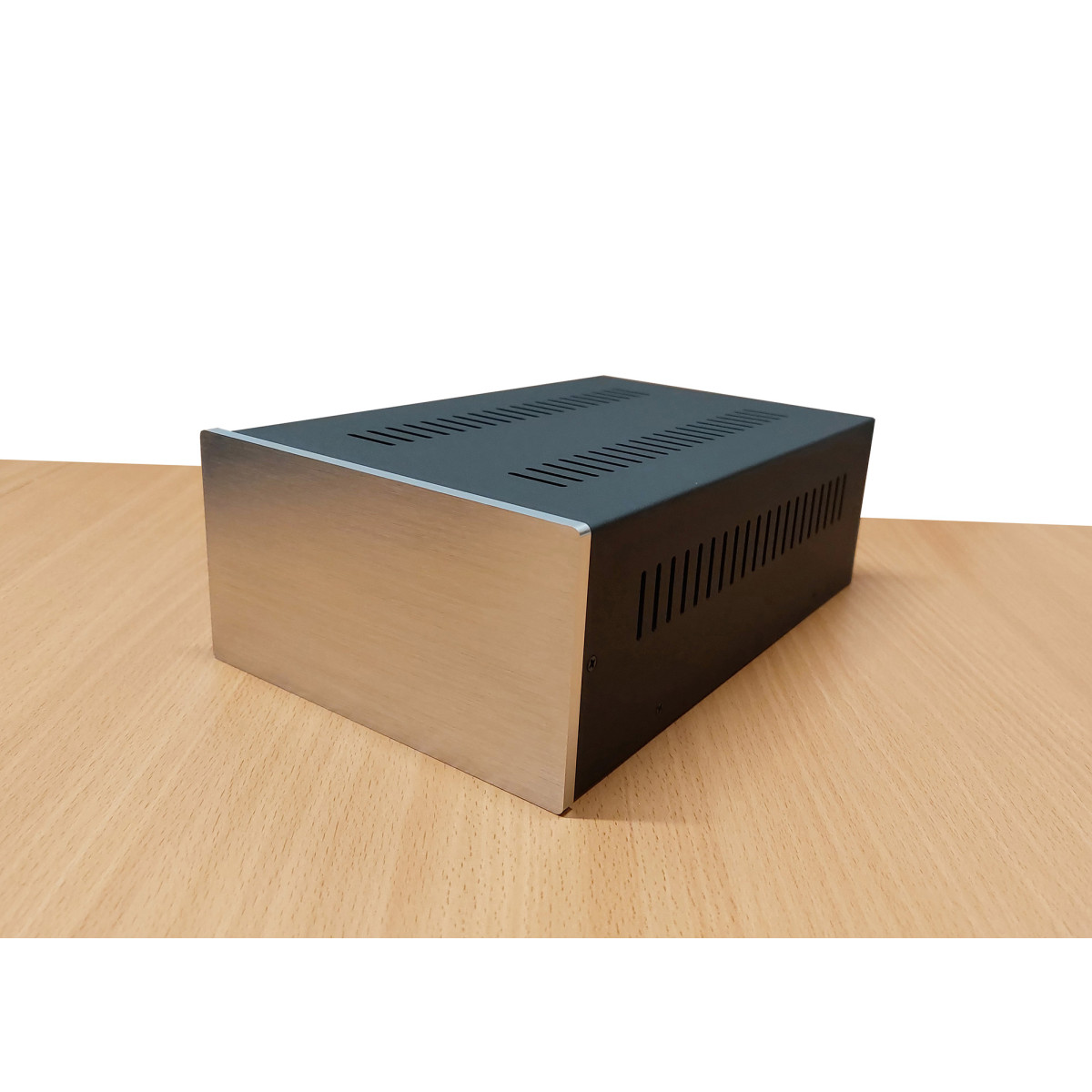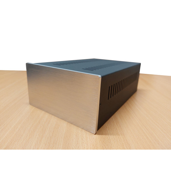 Передняя панель сделана из алюминия толщиной 6 мм. Качество панели очень высокое. На панели выполнена декоративная обработка (шлифовка в одном направлении). Покрытие панели - анодирование под серебро. Она имеет шикарный и очень стильный вид.
