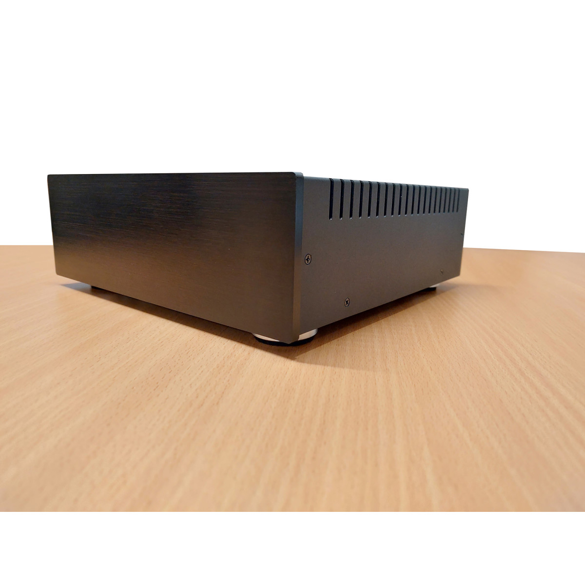 Передняя панель сделана из алюминия толщиной 6 мм. Качество панели очень высокое. На панели выполнена декоративная обработка (шлифовка в одном направлении). Покрытие панели - анодирование под серебро. Она имеет шикарный и очень стильный вид.