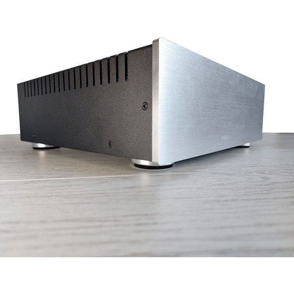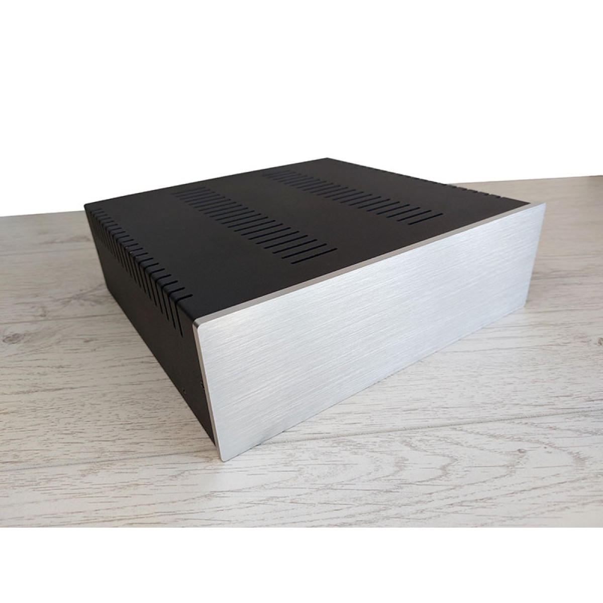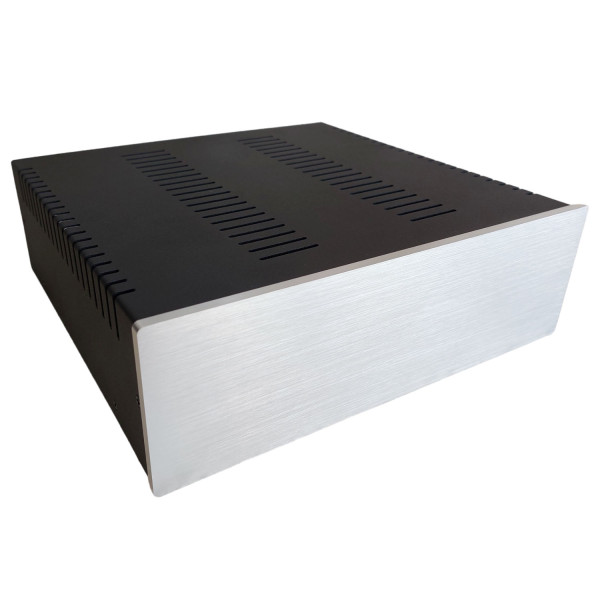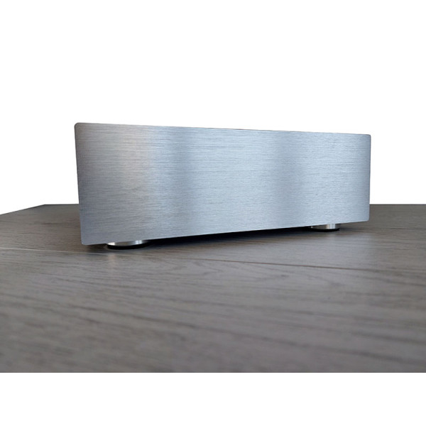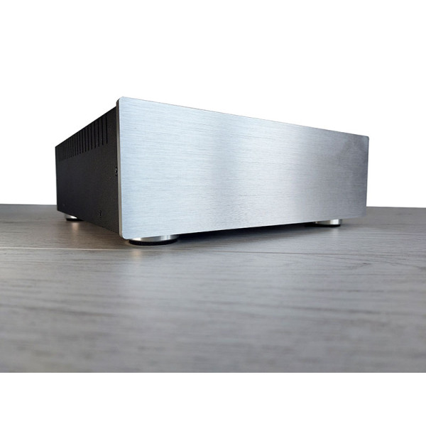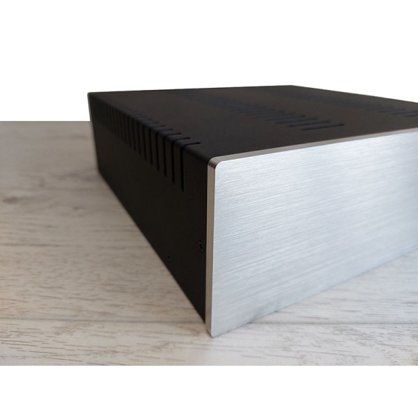 Передняя панель сделана из алюминия толщиной 6 мм. Качество панели очень высокое. На панели выполнена декоративная обработка (шлифовка в одном направлении). Покрытие панели - анодирование под серебро. Она имеет шикарный и очень стильный вид.