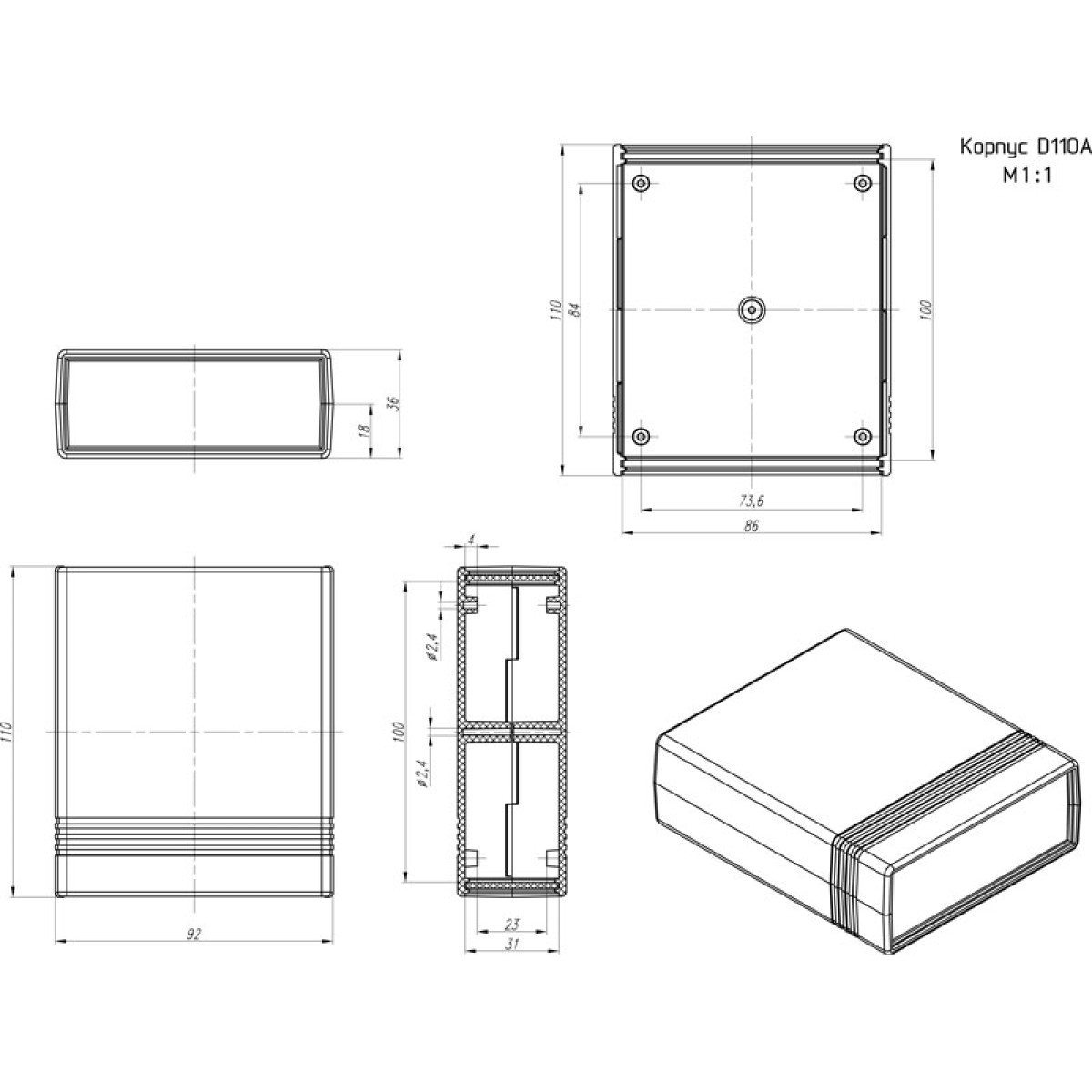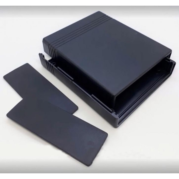 Корпус для електроніки. Корпус складається із двох однакових половинок. У корпусі передбачені кріпильні стійки та пази. Частини корпусу можна склеїти (для нерозбірних пристроїв) або скрутити тонкими довгими гвинами або шурупами, але для такого з'єднання потрібна невелика механічна доробка - потрібно просвердлити в одній з частин отвори.