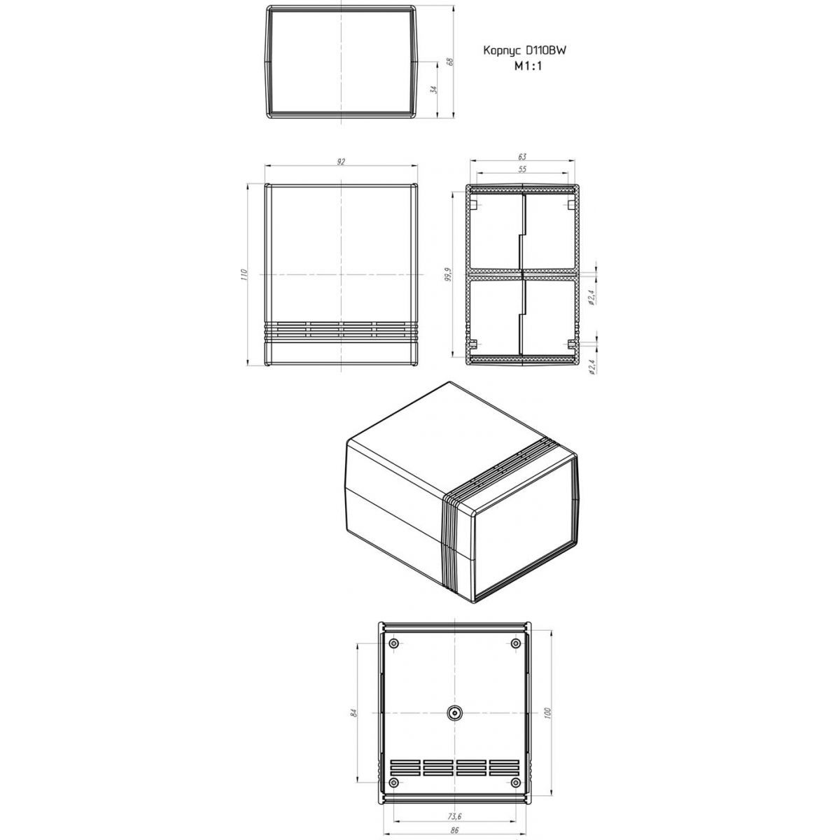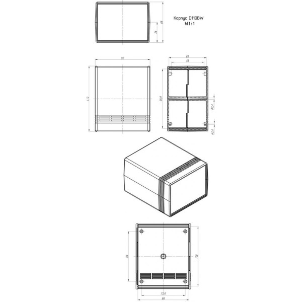 Корпус для електроніки. Корпус складається із двох однакових половинок. У корпусі передбачені кріпильні стійки та пази. Частини корпусу можна склеїти (для нерозбірних пристроїв) або скрутити тонкими довгими гвинами або шурупами, але для такого з'єднання потрібна невелика механічна доробка - потрібно просвердлити в одній з частин отвори. Також в корпусі є отвори, що охолоджують, для природного охолодження електроніки.