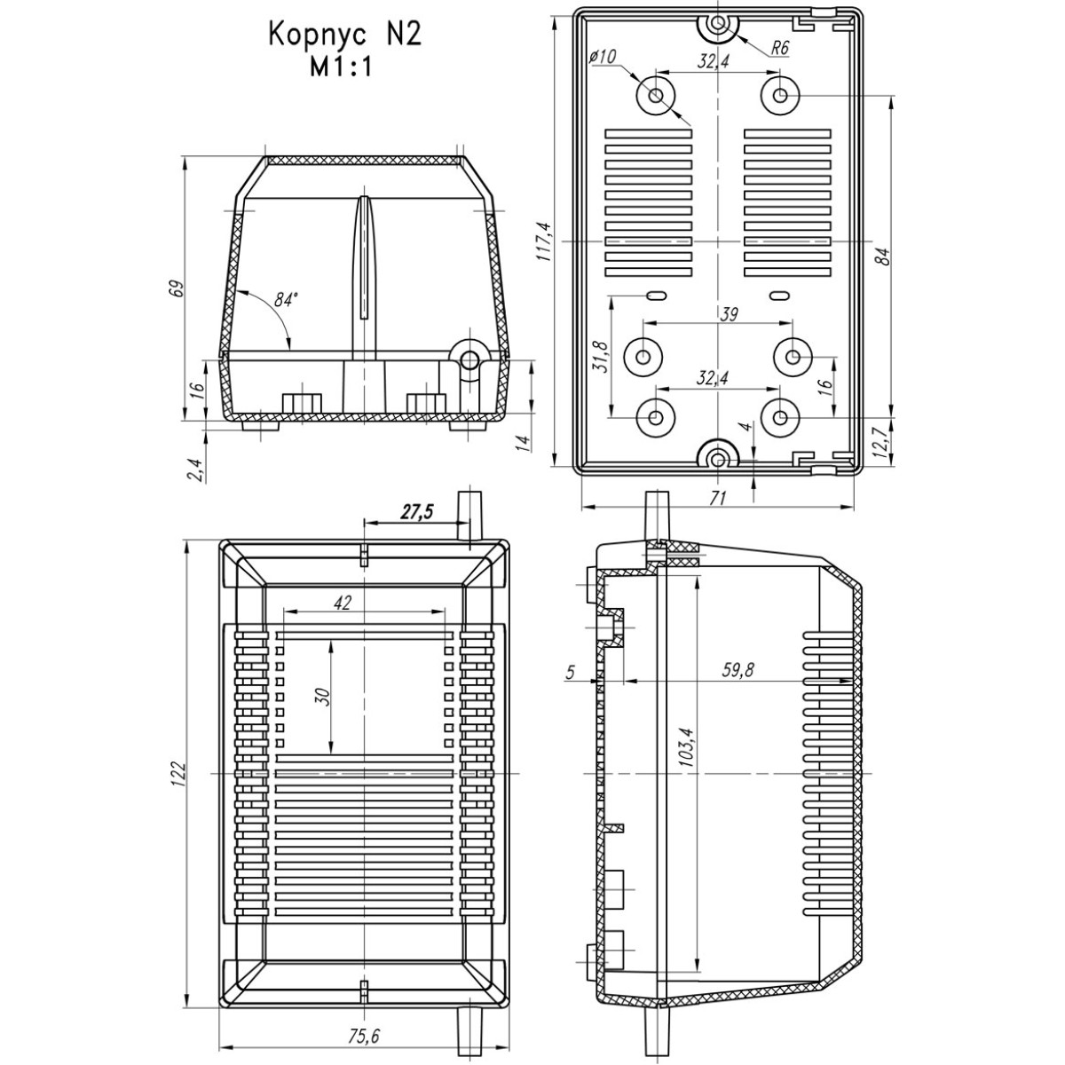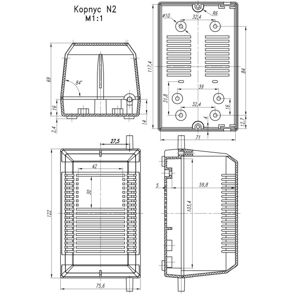 Розмір 69x76x122мм. Складається з кришки та основи, які збираються за допомогою 2-х шурупів Ø3х15мм. В основі розташовані 2 гнучкі введення R2 для кабелю -Ø4,5мм. Стандартний колір корпусу – чорний;