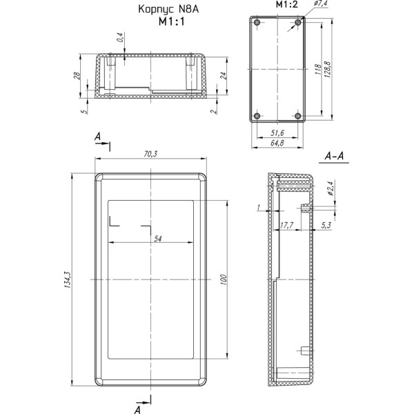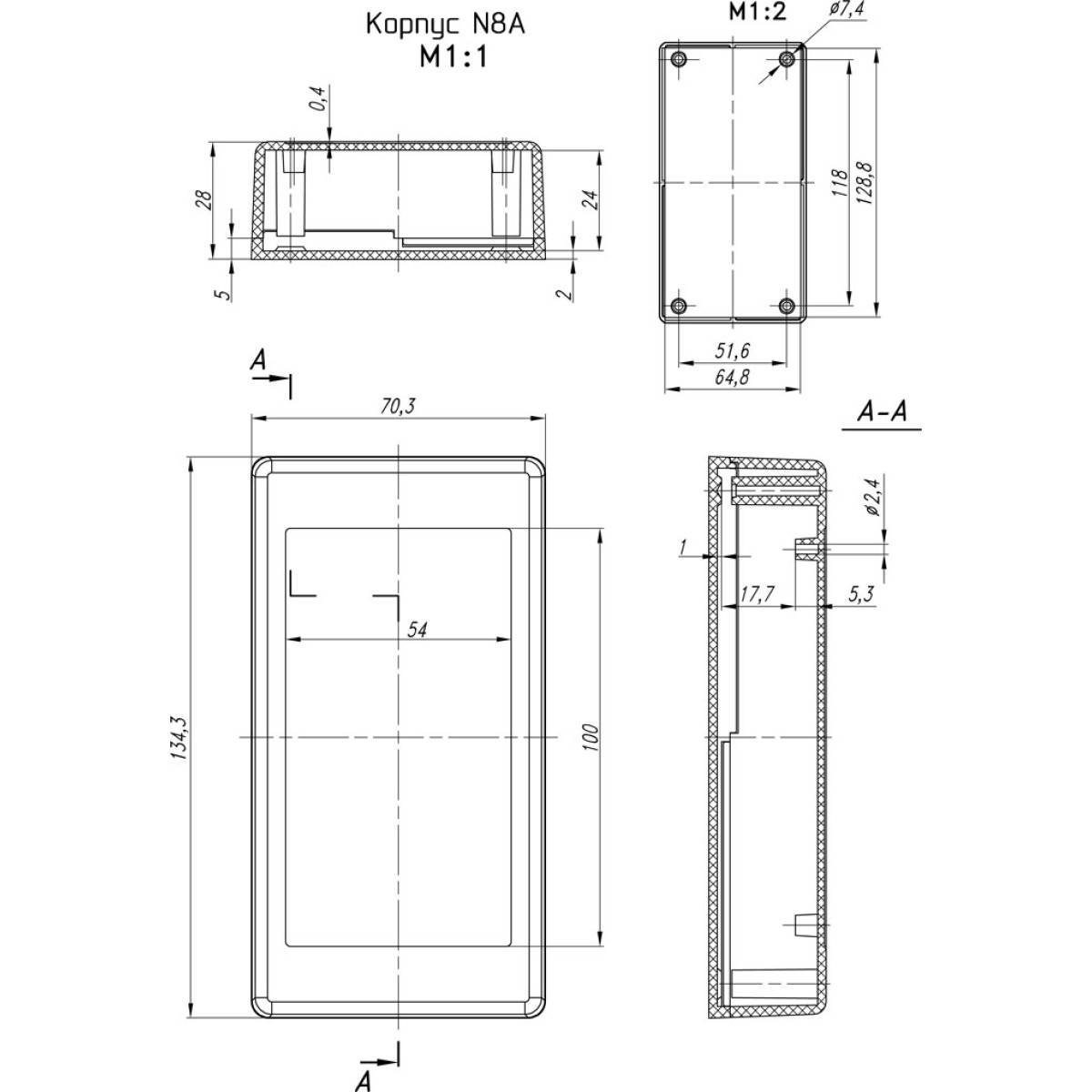 Корпус для електроніки. Корпус складається із двох однакових половинок. У корпусі передбачені кріпильні стійки та пази. Частини корпусу можна склеїти (для нерозбірних пристроїв) або скрутити тонкими довгими гвинами або шурупами, але для такого з'єднання потрібна невелика механічна доробка - потрібно просвердлити в одній з частин отвори.