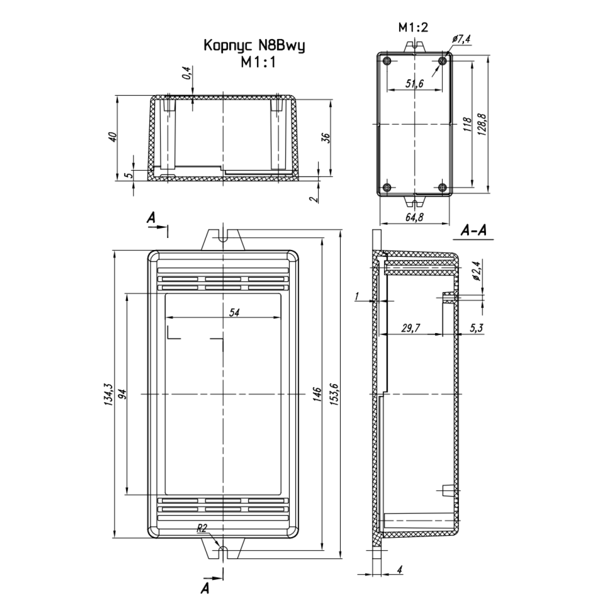 Корпус для електроніки. Корпус складається із двох однакових половинок. Кришка йде з кріпленнями для монтажу. У корпусі передбачені кріпильні стійки та пази. Частини корпусу можна склеїти (для нерозбірних пристроїв) або скрутити тонкими довгими гвинами або шурупами, але для такого з'єднання потрібна невелика механічна доробка - потрібно просвердлити в одній з частин отвори. Також в корпусі є отвори, що охолоджують, для природного охолодження електроніки.